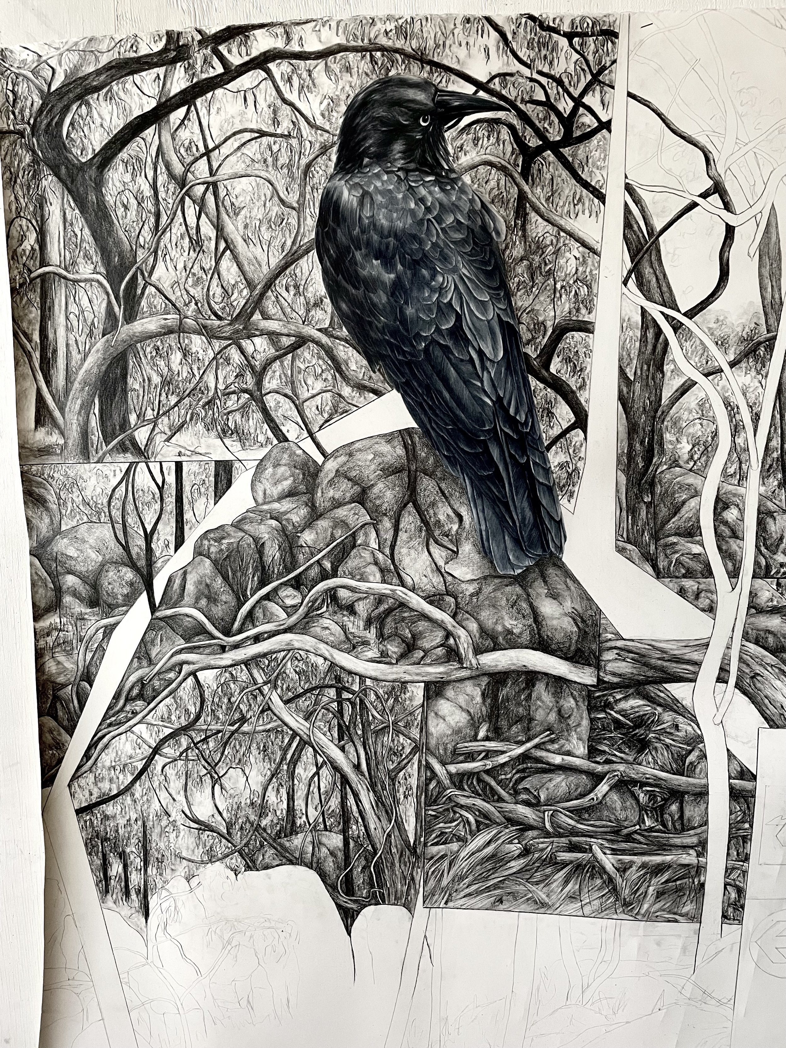 Above: A snapshot of a sample section of the latest piece in the Urban Shadows series, which features two Australian Ravens in conversation. (2024, 150 x 170cm, graphite & watercolour)