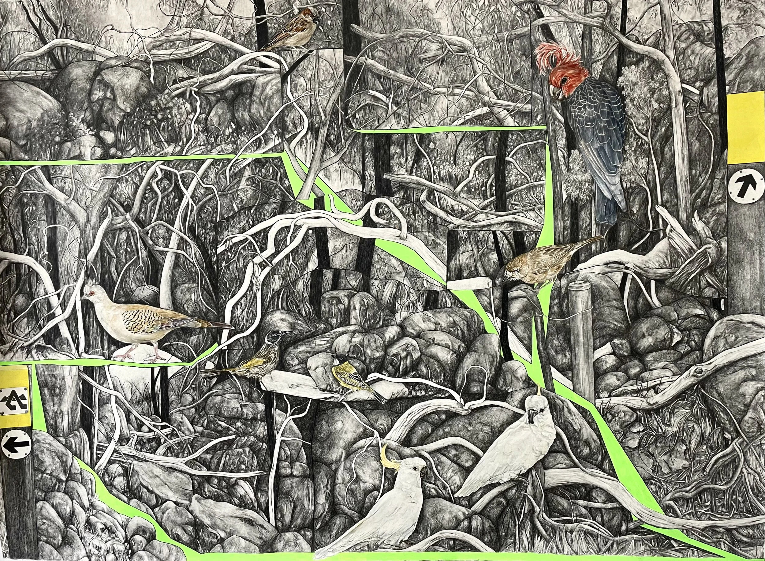 Each piece is a layered landscape which involves a process of three stages – the first stage is a detailed drawing of native birds and wildlife, done to completion. The second stage is the composition and execution of a delicate landscape which the wildlife inhabits; and the third stage is the layering of the dark urban shadows: sharp geometric shapes which loom over the delicate bush landscape. Essentially three pieces of work connected and presented as one. It follows a narrative arc detailing the delicate balance of life and death, literally and figuratively.